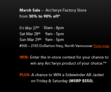 All Arc'teryx email communications are sent from crm@arcteryx.com. To ensure you keep hearing from us, please use this address when configuring email filter rules, if you use them.